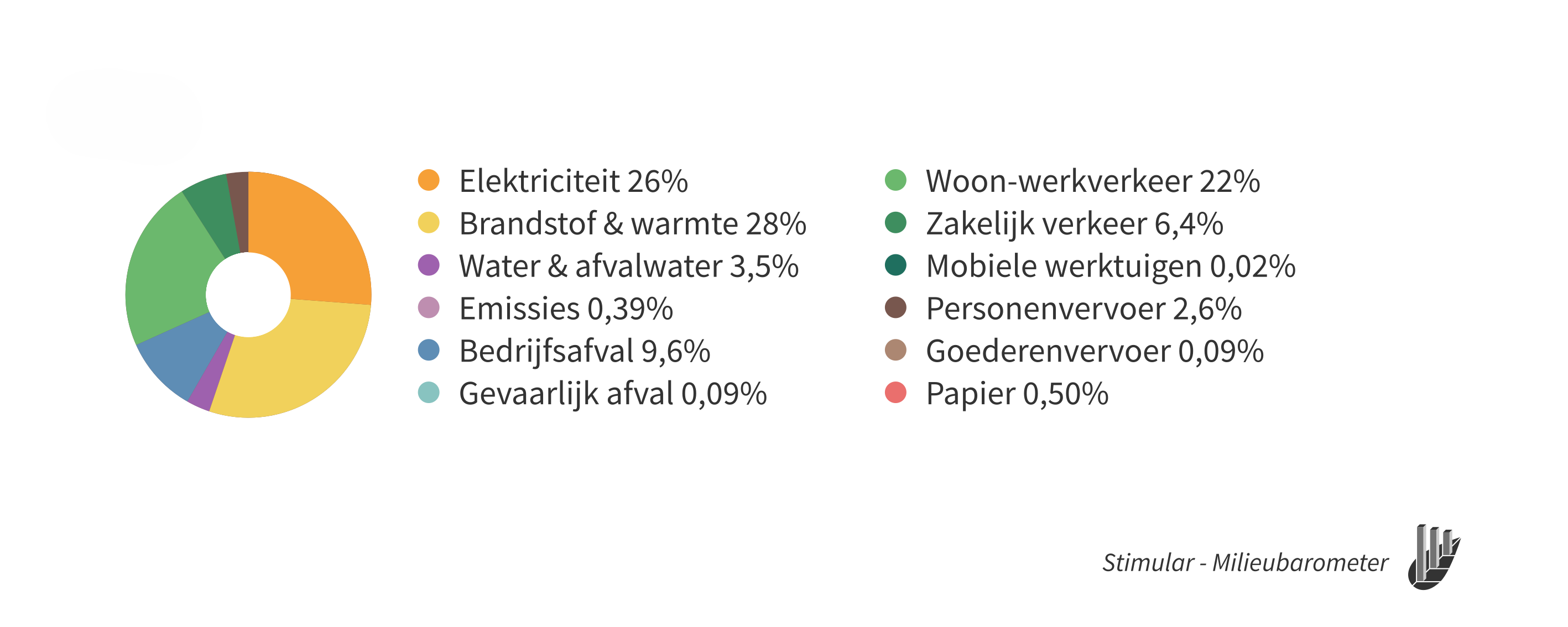 Ook het bedrijfsafval en in mindere mate zakelijk verkeer beslaan een significant aandeel in de totale milieu-impact. Water en personenvervoer tellen wel mee, maar zijn veel minder belangrijk.