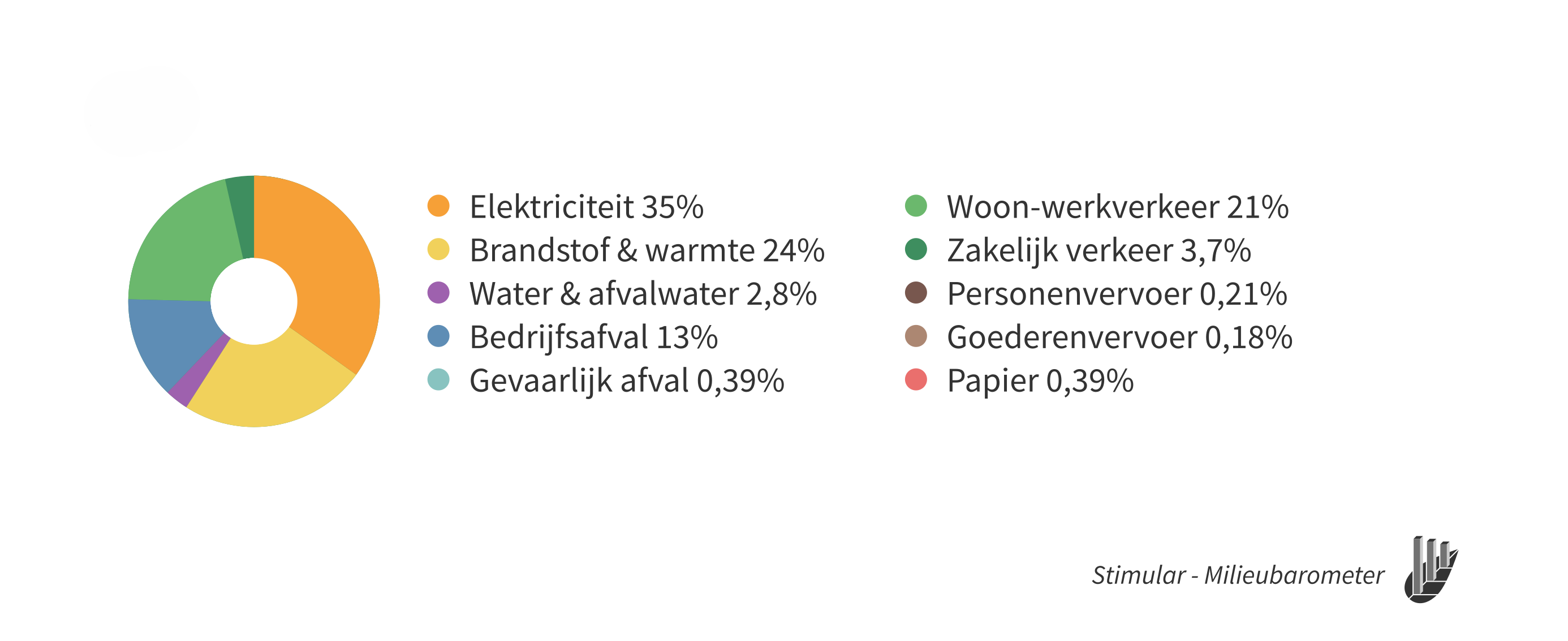 Ook het bedrijfsafval beslaan een redelijk aandeel in de totale milieu-impact. Zakelijk verkeer, gevaarlijk afval, water & afvalwater en personenvervoer tellen wel mee, maar zijn veel minder belangrijk.
