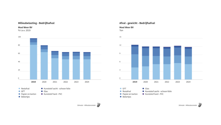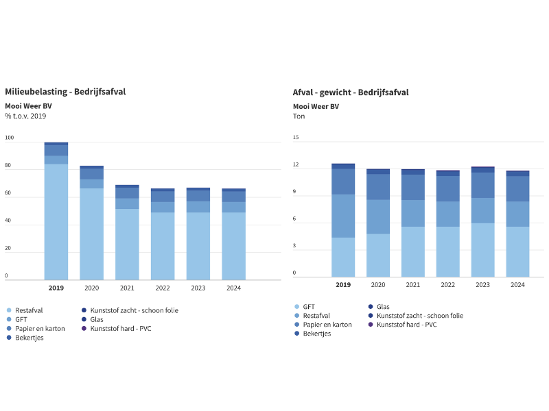 Sinds begin 2025 kun je in de Milieubarometer ook je afvalgewicht volgen. De nieuwe grafiek toont hoeveel kilogram afval je produceert, uitgesplitst naar verschillende categorieën binnen bedrijfsafval en gevaarlijk afval.