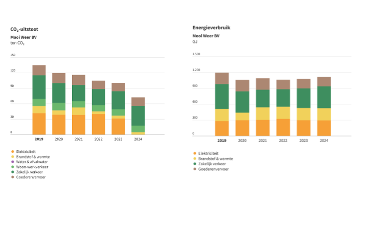 Vanaf 2025 heeft de Milieubarometer er een nieuwe grafiek bij, het energieverbruik van je organisatie, inclusief brandstof voor bedrijfsvoertuigen. Deze weergave sluit aan bij scope 1 en 2 van de CO₂‑footprint en bij de CSRD-tabel.