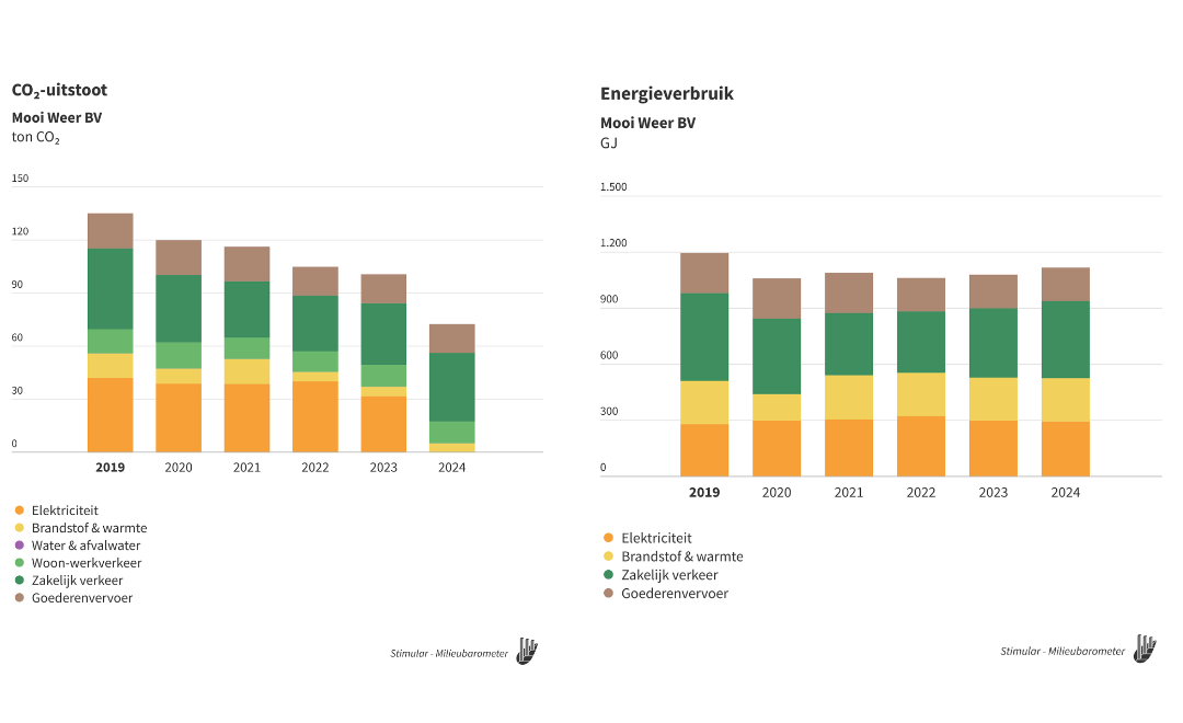 Vanaf 2025 heeft de Milieubarometer er een nieuwe grafiek bij, het energieverbruik van je organisatie, inclusief brandstof voor bedrijfsvoertuigen. Deze weergave sluit aan bij scope 1 en 2 van de CO₂‑footprint en bij de CSRD-tabel.